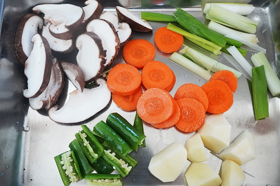야채는 찜닭이 끓을 때 자연스럽게 익도록 큼직하게 썰어야 식감이 살아납니다.