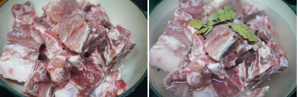 냄비에 등뼈를 넣고 등뼈가 충분히 잠길 정도의 물을 부어주세요.