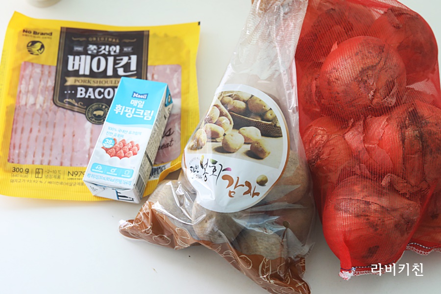 감자 2개, 베이컨 2줄, 양송이버섯 3개
