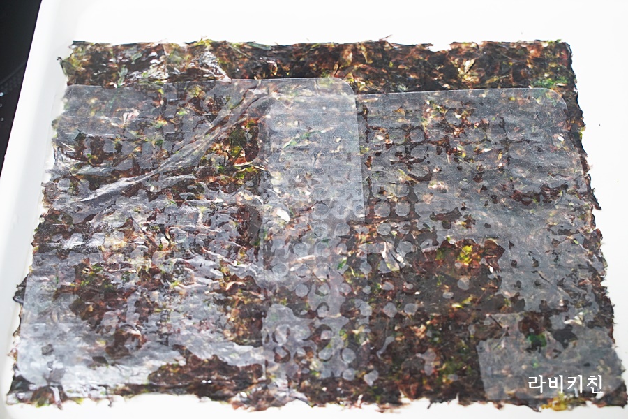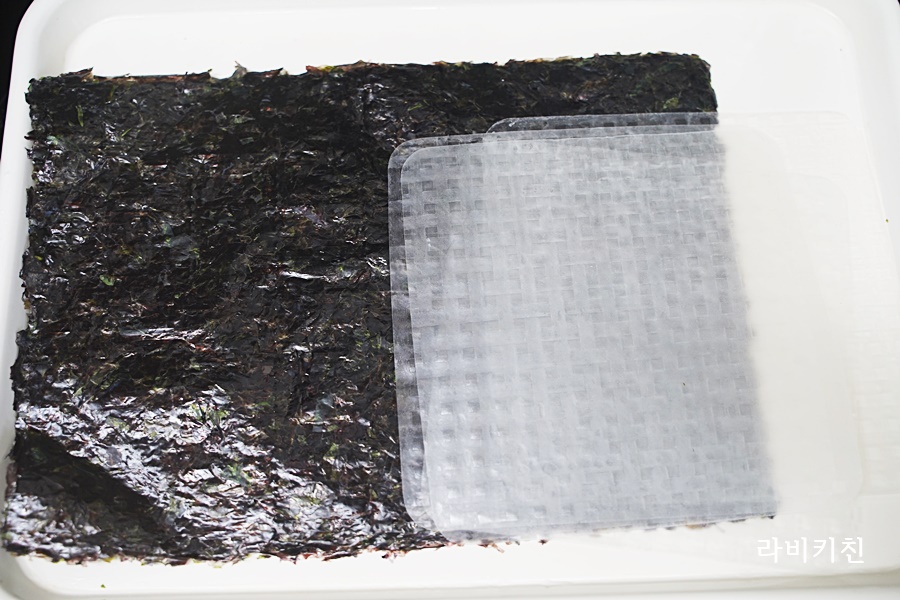 그리고 빠르게 김에 라이스페이퍼를 부착시켜주세요