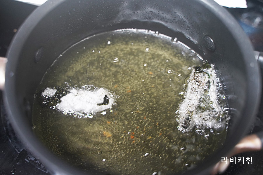 기름이 달궈지면 중간 불로 줄여주세요 정말 넣자마자 바로 튀겨지는 튀김요리 김간식 김부각이기 때문에 그리 강한 불에서 튀기지 않아도 좋습니다