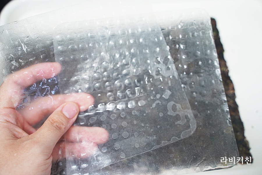 김을 바닥에 두고 라이스페이퍼를 물에 적셔주세요