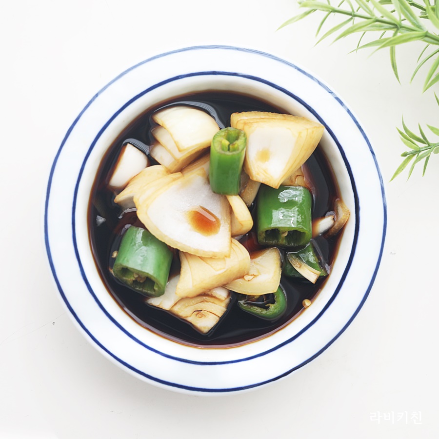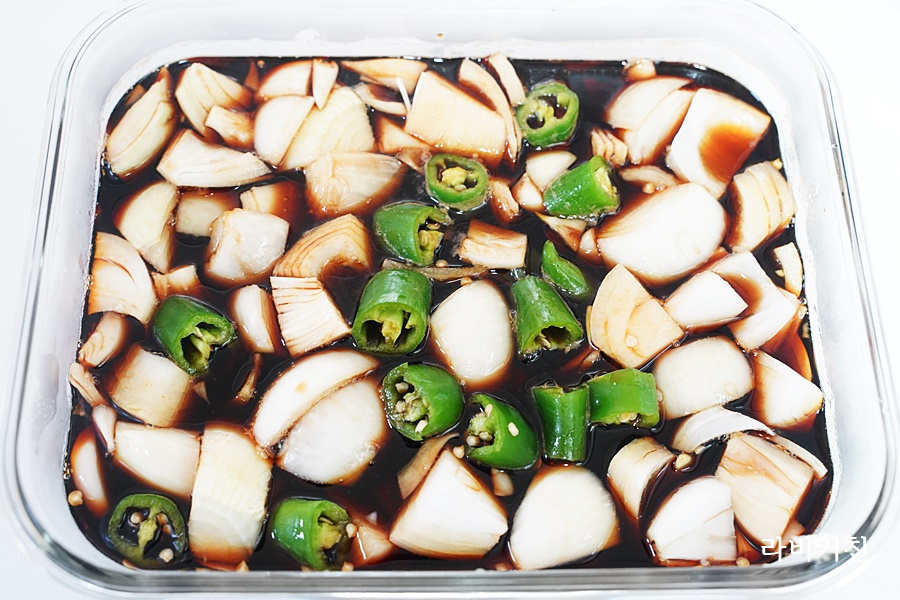 그러나 용기는 꼭 유리나 스테인리스 용기를 사용해 주세요. 간장 물이 뜨거울 때 바로 넣어야지 아삭아삭하게 된답니다.