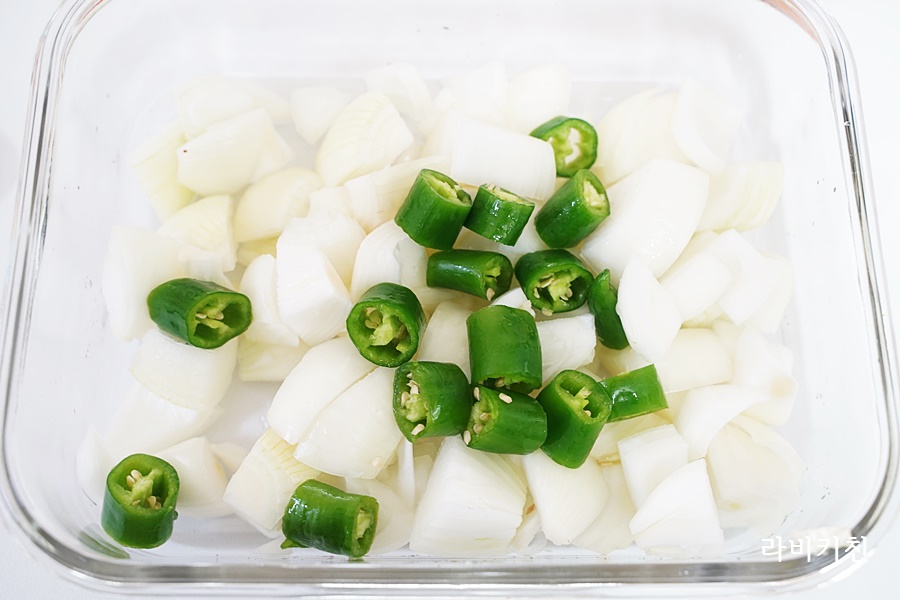 이렇게 간장 물은 양파와 고추를 담은 그릇에 부어주기만 하면 세상 쉬워요.