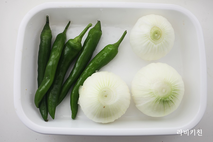 고추와 양파는 깨끗하게 씻어주는데요. 햇양파라 그런지 싱그러움이 느껴졌어요. 양파만 넣어서 만들면 심심하니 고추를 살짝 넣어주는 것도 좋겠죠