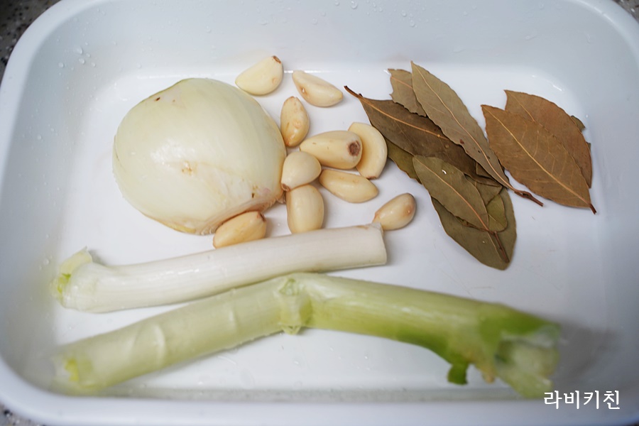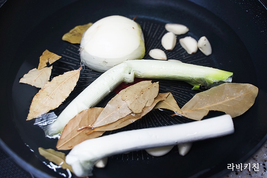 월계수잎, 양파와, 대파, 마늘을 넣어줍니다