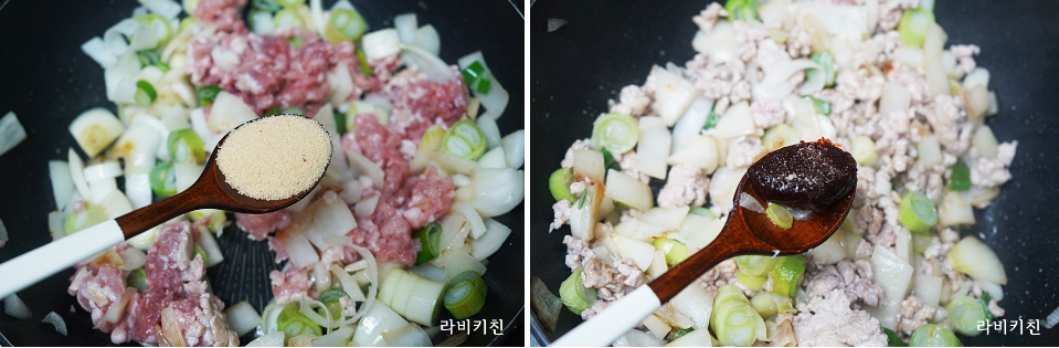 양파와 대파가 노릇노릇하게 잘 볶아졌다면 이때 돼지고기 다짐육을 넣습니다