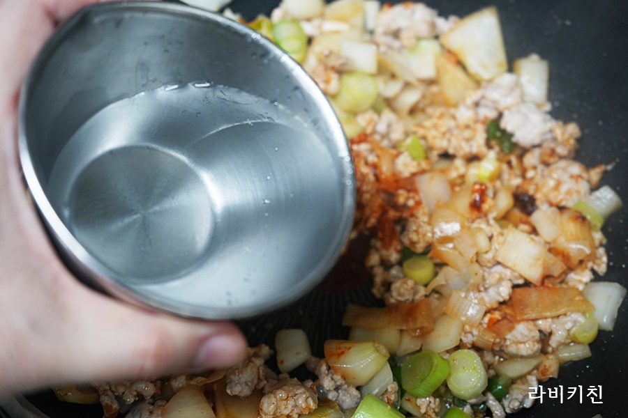 어느 정도 재료들이 익었다고 생각이 들면 물을 넣습니다