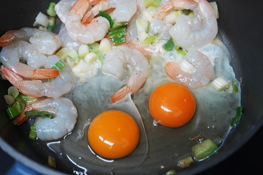 새우를 한쪽으로 몰아준 후 계란 2개를 넣어주세요