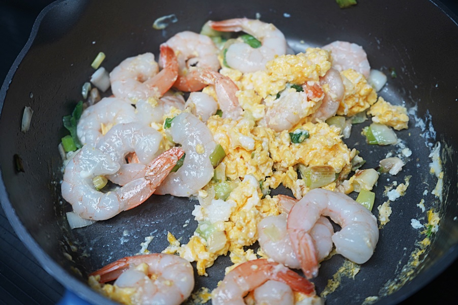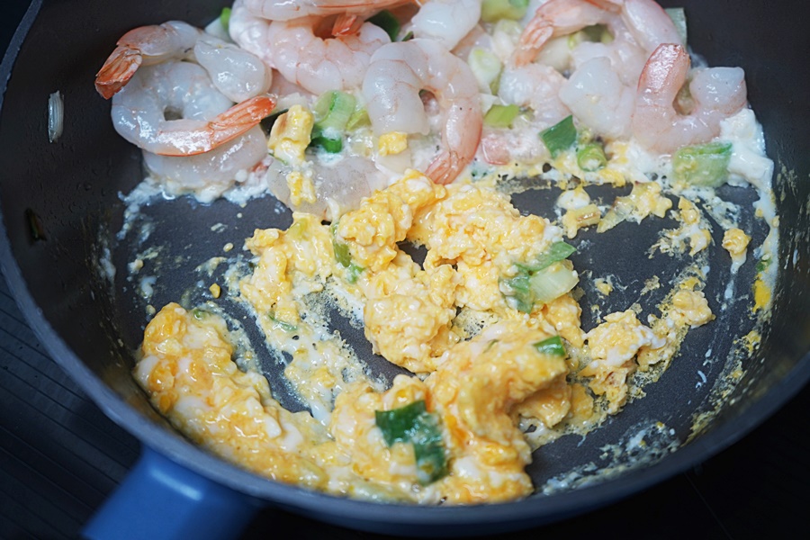 계란 스크램블은 새우와 대파 볶은 것과 섞어주세요!