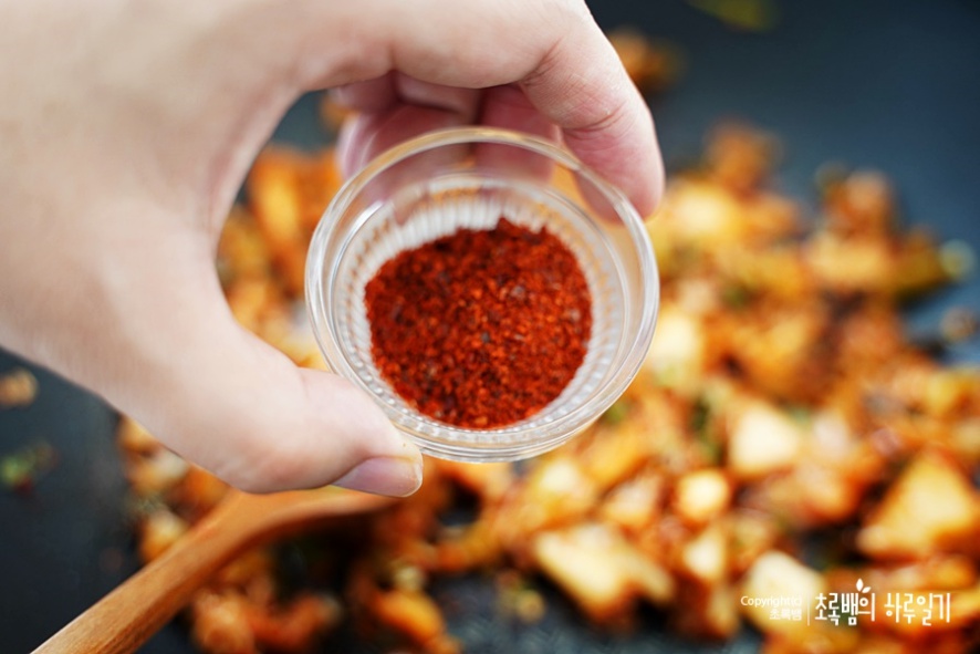 마지막으로 색깔을 위해서~ 고춧가루 1스푼을 넣어줍니다 강식당 김치밥을 위한 베이스가 완성되었는데요 이것만 먹어도 개인적으로 맛있더라고요 반찬으로 먹어도 참 좋아요