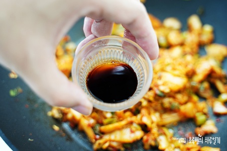 이제 간을 할 차례 김치를 먹어보고 어느 정도 간이 되었는지 확인하는 것이 중요해요. 집집마다 김치의 짠맛이 다르기에 이왕이면 간이 세지 않게 하는 것이 중요한데요. 저는 김치볶음이 그다지 짜지 않아서 1스푼을 넣어주었어요. 간장은 팬의 가장자리에서 살짝 뿌려주면 탄 것처럼 김치볶음이 맛있어집니다.