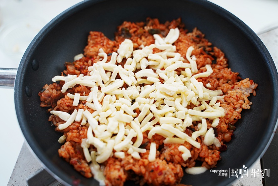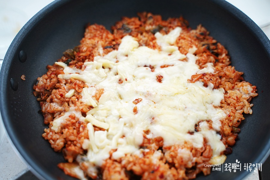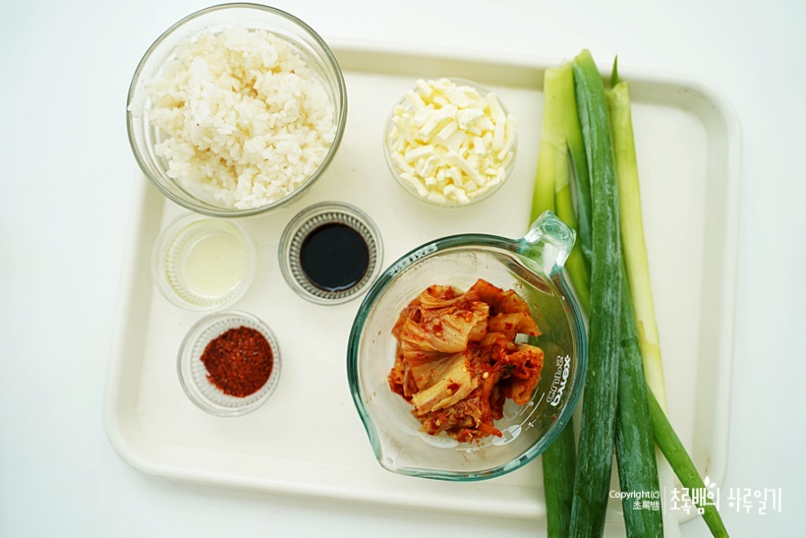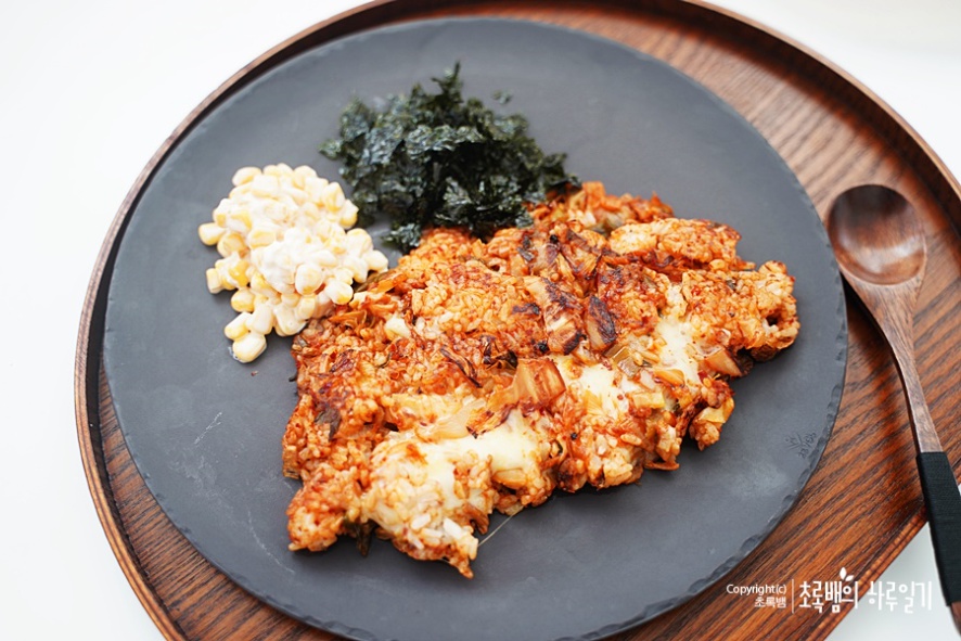 재료 : 김치 한 줌, 식용유 2스푼, 간장 1스푼, 고춧가루 1스푼, 대파 1대, 설탕 1/2스푼, 밥 1공기, 피자치즈, 김가루
