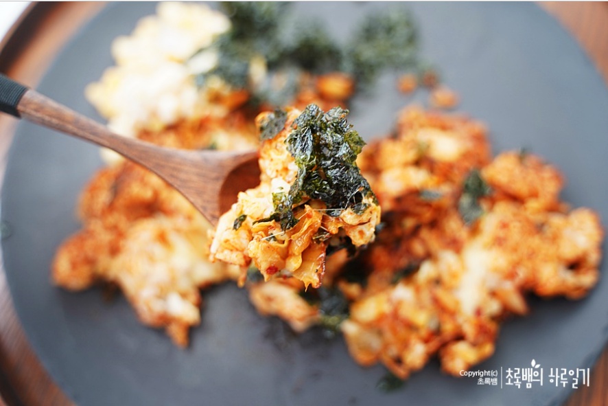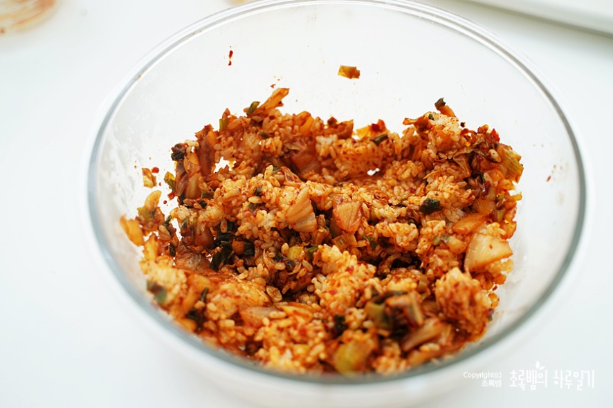 저는 1인분으로 대충 만들었는데요 직접 보신 분들이라면 대용량이라 정확한 레시피는 나오지 않았어요 하지만 만들다 보면 대략 느낌이라는 것이 있는데 우선 김치 양념에 밥을 비벼서 만드는 것이기 때문에 비빌 때 김치볶음과 밥을 잘 섞어서 간만 맞추면 거의 된다고 생각하시면 될 것 같아요 김치볶음 외에도 김가루와 옥수수샐러드를 넣었는데 따로 레시피는 없지만 대충 김을 잘라서 준비하고 옥수수는 마요네즈에 버무려서 만들어보았습니다