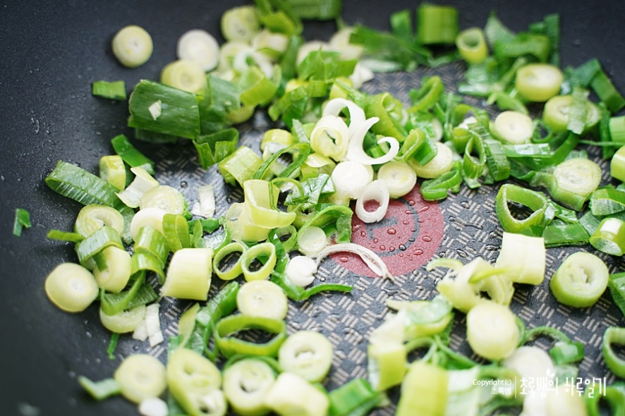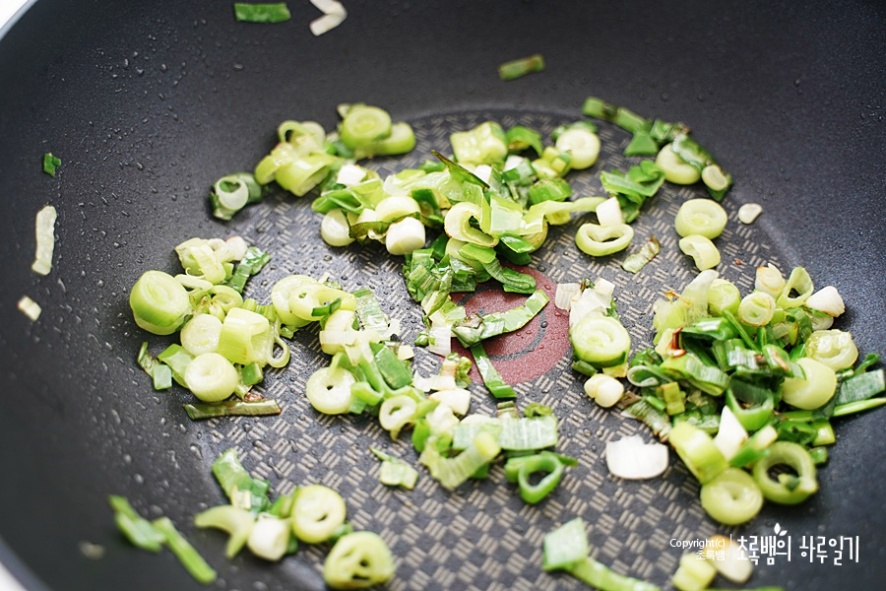 그다음 잘게 썰어 둔 대파를 넣고 노릇노릇해질 때까지 볶아서 준비합니다 파 향이 어찌나 좋던지~~ 냄새가 너무 좋아요