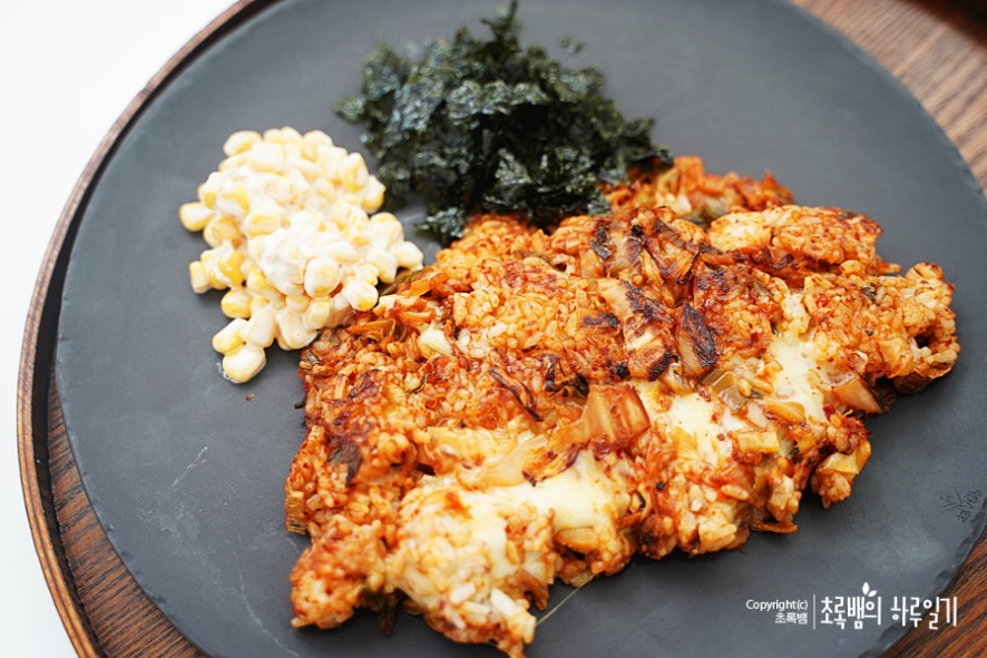 여기다 아까 만들어준 콘 샐러드와 그리고 김가루를 올려주면 강식당에서 본 김치밥이 완성되었습니다 만드는 방법 그다지 어렵지 않죠? 김치볶음밥에 피자치즈를 올려주는 것이라고 생각하면 간단한데요