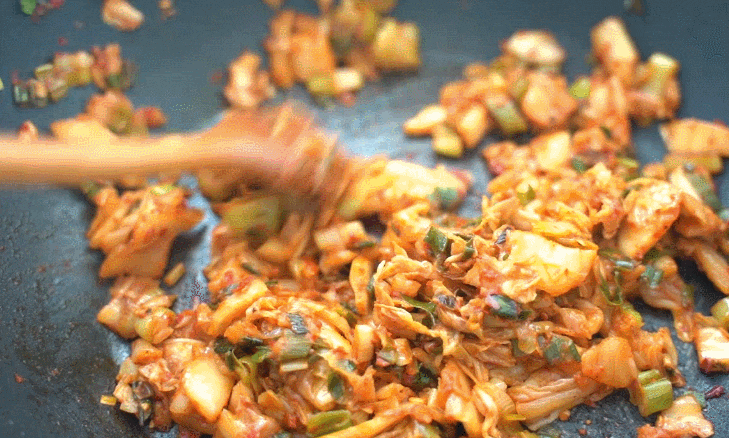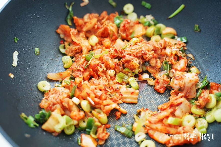 파 기름이 이렇게 만들어지면 김치를 넣어줍니다 김치는 넉넉하게 넣어주셔도 좋고 어차피 부족한 간은 간장을 넣고 간을 해주기 때문에 취향껏 넣어주면 좋을 것 같아요