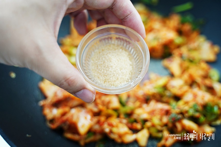 김치의 신맛을 잡아주기 위해서 설탕을 1/2스푼 넣어주었어요 생략도 가능하지만 저는 신 김치라 살짝 넣어주었어요~