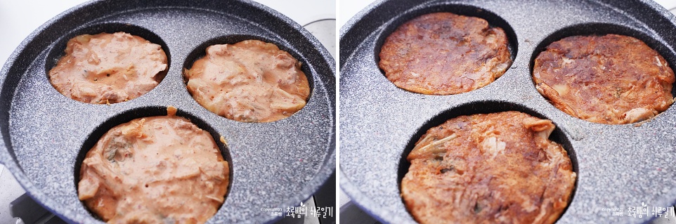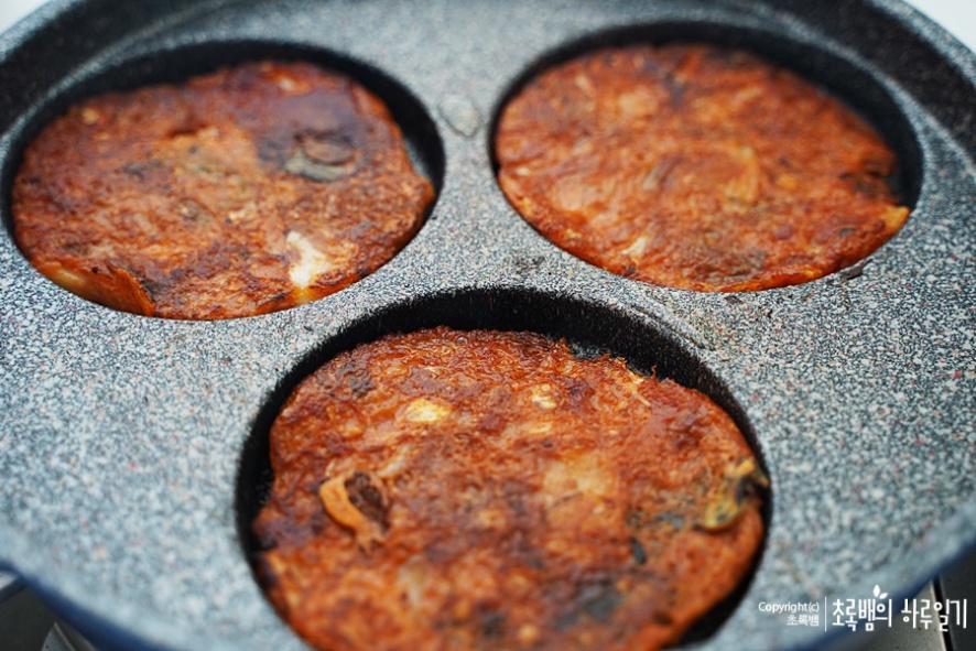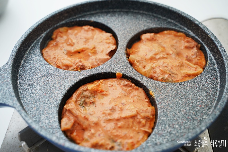 저는 반죽 자체가 빨개서 고춧가루를 넣어주지 않았는데요 김치의 양념이 별로 없어서 반죽이 하얗다면 고춧가루를 추가해주면 될 것 같아요