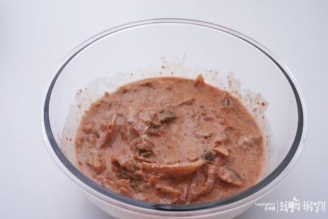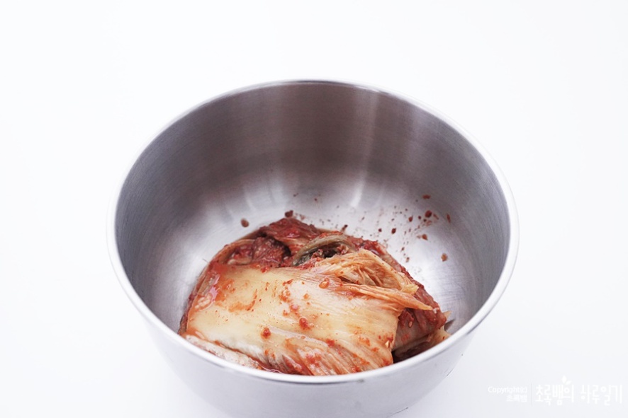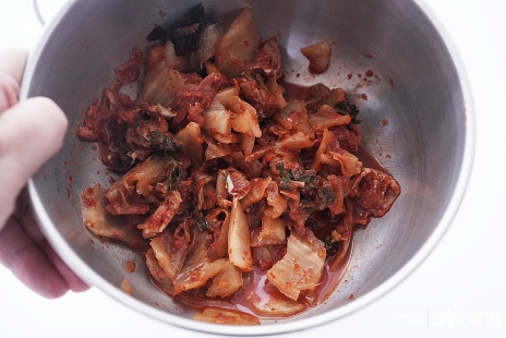 도마와 칼을 가지고 잘라주면 되겠지만 아무래도 뒤처리가 힘드니 이렇게 넓은 볼에 김치를 넣어주고 사정없이 가위로 샥샥 잘라서 준비해줍니다