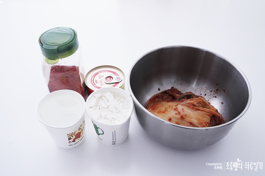 재료 : 김치 2컵, 밀가루 1컵, 물 1컵, 참치 1캔, 고춧가루 약간(생략 가능), 식용유