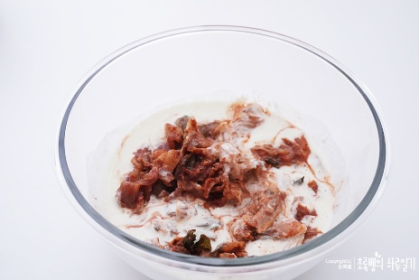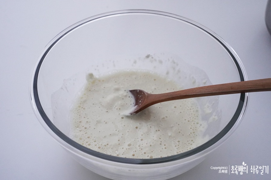 그다음 잘게 썰은 김치를 넣어줍니다 반죽과 잘 섞이도록 스푼으로 잘 저어줍니다.