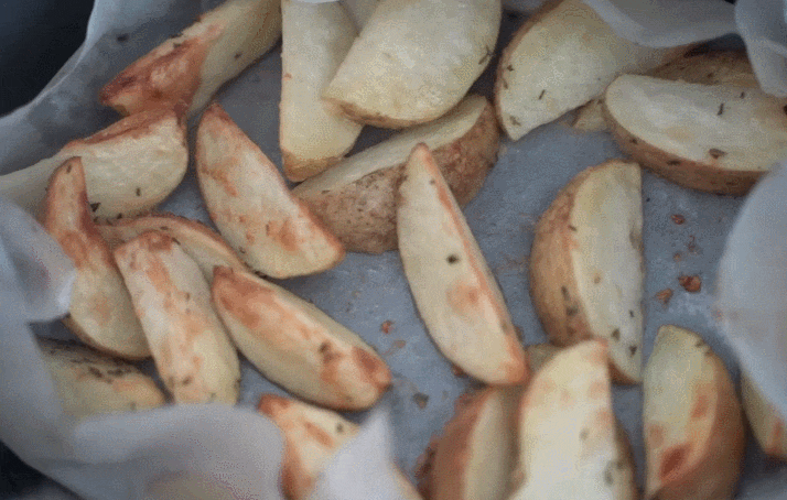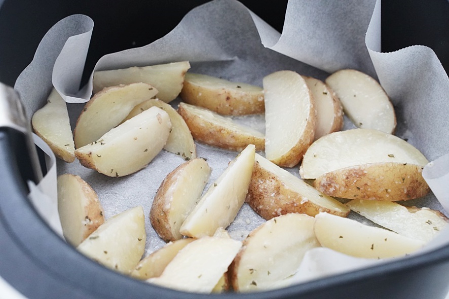 에어프라이어에 종이호일을 한 장 깔아준 후겹치지 않게 양념된 감자를 넣어줍니다. 겹치지 않아야지 노릇노릇 잘 익는답니다.