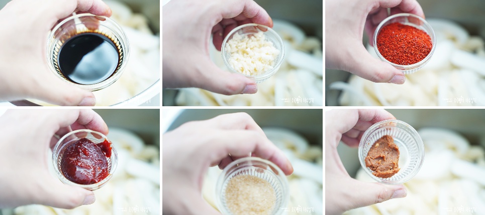 고추장 1스푼, 된장 1/3스푼, 고춧가루 2스푼, 설탕 1스푼, 진간장 4스푼, 다진 마늘 1스푼을 차례대로 넣어줍니다. 백종원 감자짜글이 찌개는이렇게 모든 재료를 넣고 한 번에 끓여주는데요.