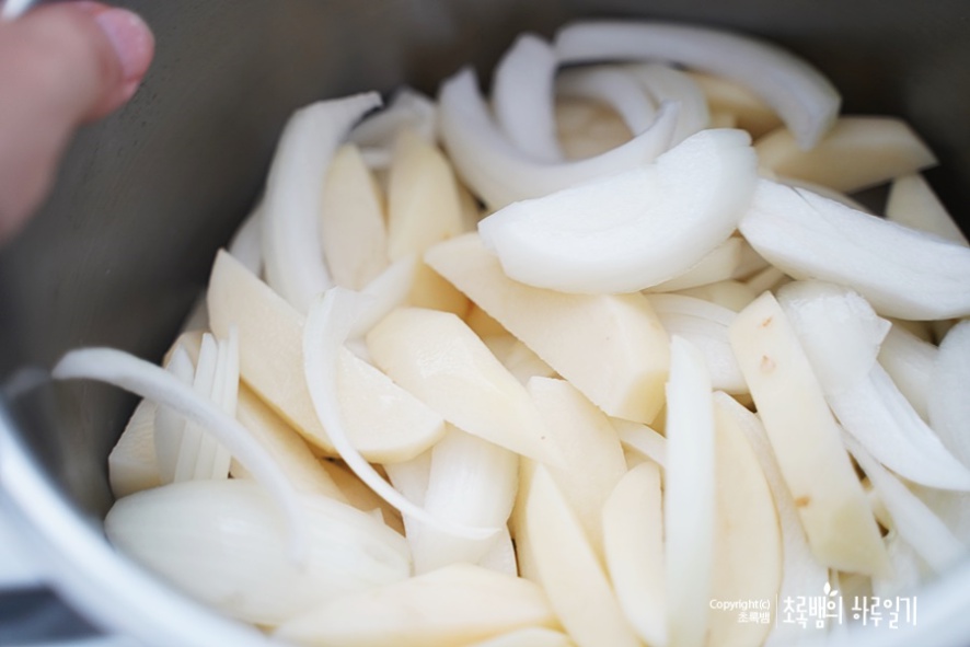 재료들이 준비되었다면 이렇게 냄비에감자와 양파를 넣어줍니다. 그다음 차례대로 양념들을 넣어줍니다.