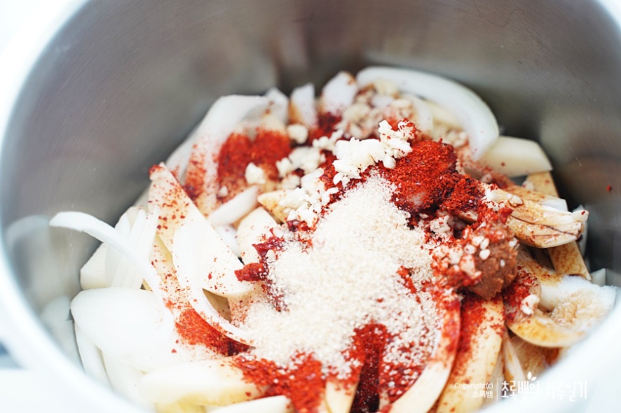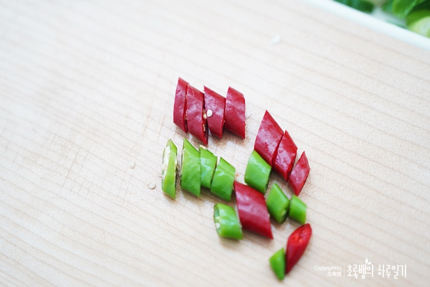 그리고 청양고추를 넣어주는데요. 매운 것을 좋아하면 더 넣어주셔도 좋아요저는 청양고추 1개와 홍고추 1개를 사용했어요.
