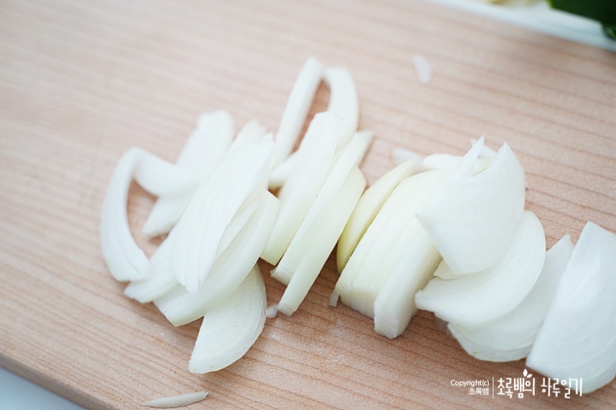 양파도 1개를 너무 얇지도 두껍지도 않게 이렇게 저며서 썰어줍니다.