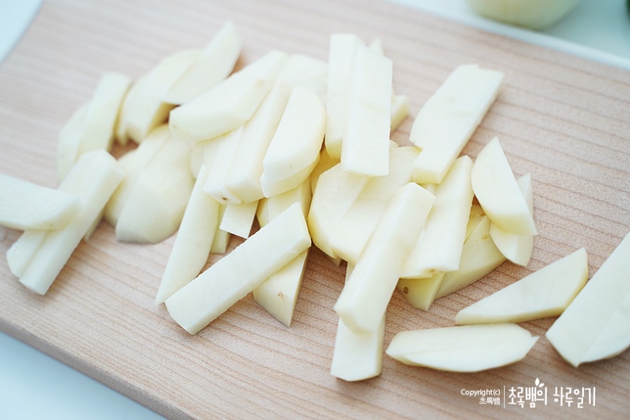 감자는 3개를 얇게 잘라주는데요.두께는 대략 새끼손가락의 두께 정도로잘라줍니다. 감자는 3개인데 큰 감자는 2개를 사용하는 것이 좋아요. 너무 양이 많아지니 조절하면 되겠죠?