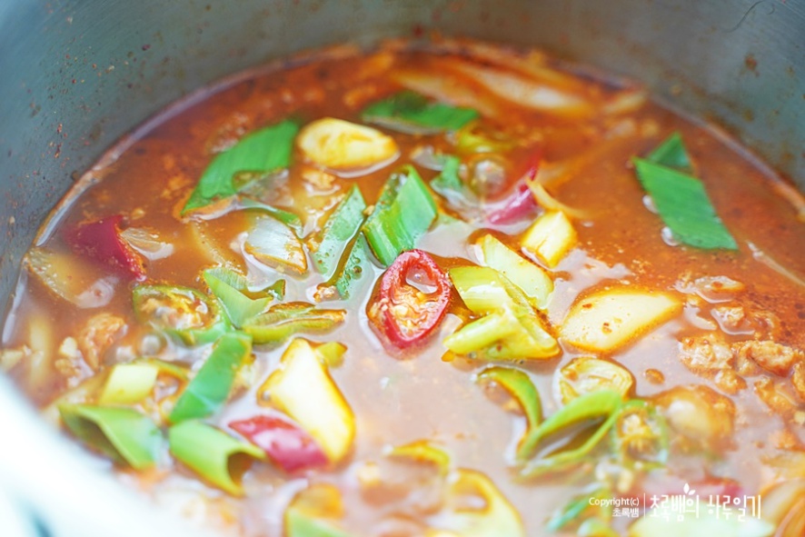 어느 정도 다 되었다고 생각이 들면 대파와 그리고 청양고추 홍고추를차례대로 넣어주면 됩니다.