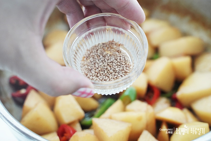 마무리는 이렇게 통깨를 약간 넣어줍니다. 통깨는 취향껏 넣어주는데 개인적으로 감자조림에는 검정깨가보기에도 좋은 것 같아요