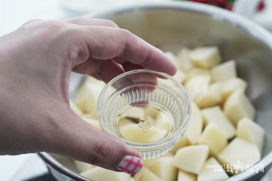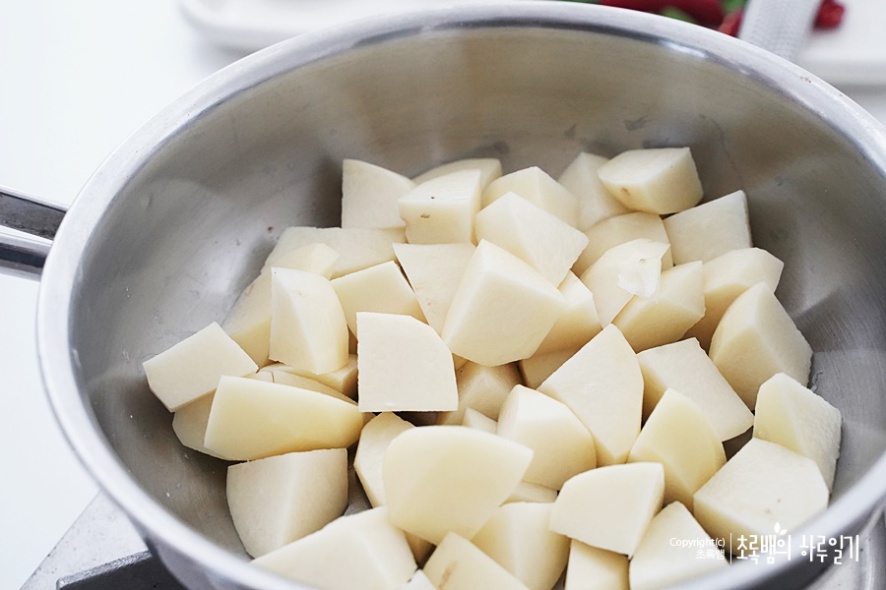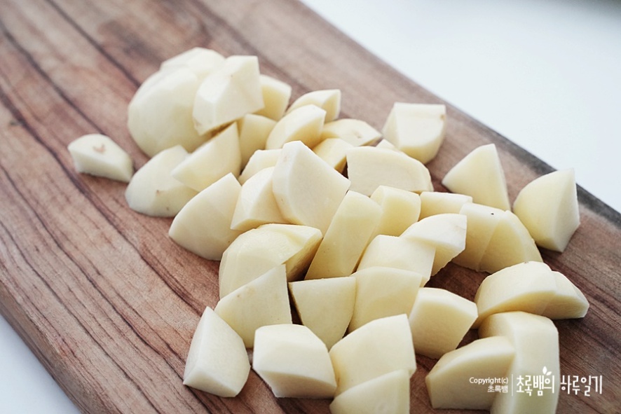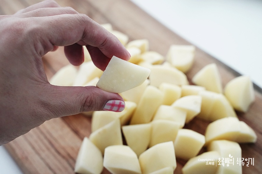 감자는 껍질을 벗겨 낸 후이렇게 깍둑썰기를 합니다
