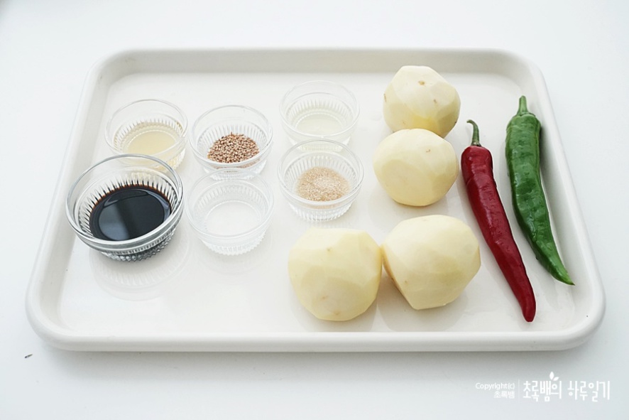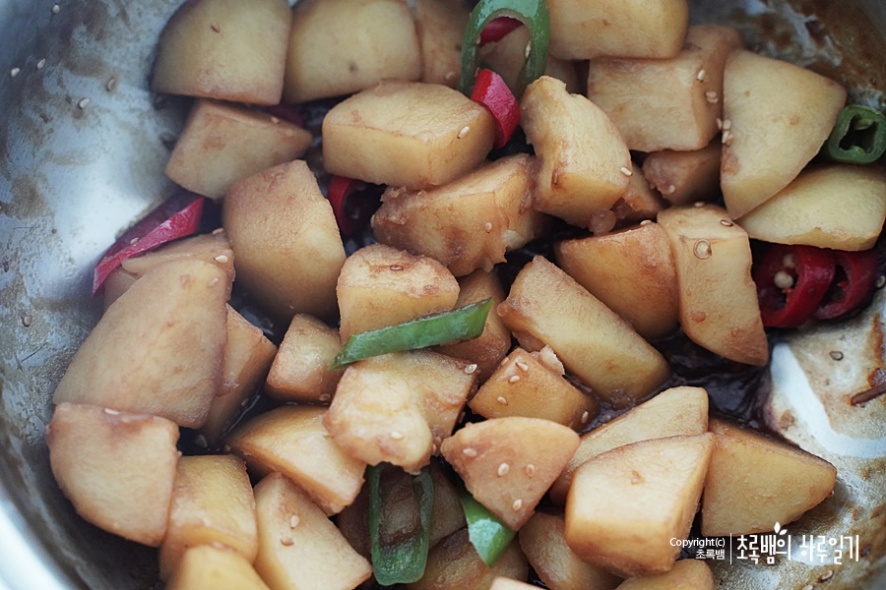 재료 : 감자 4개(작은것), 청양고추 1개, 홍고추 1개, 물 200ml 간장(3), 설탕(0.5), 올리브유(1), 꿀(1), 통깨 약간