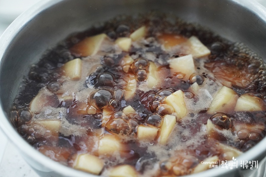 대략 이렇게 만들어지면 강불로 두어 끓은 후 중간불이나 강불로 감자가 익을 때까지 끓여줍니다. 가끔 눌어붙지 않도록 스푼을 가지고 슬쩍슬쩍 뒤섞여줍니다.