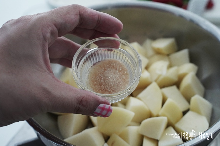 설탕은 반 스푼을 넣어줍니다. 수미네반찬 감자조림은 특이하게 물엿이나 올리고당이 전혀 들어가지 않고 설탕과 꿀로 단맛을 넣는데요. 저는 물엿이나 올리고당을 거의 사용했는데 맛이 좀 다르긴 했어요. 그리고 김수미 씨는 보통 단맛을 꿀로 내던데 꿀이 생각보다 궁합이 좋은 것 같아요.