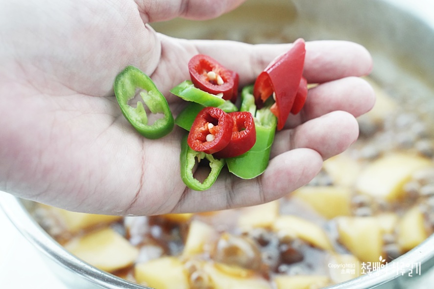 그리고 들어갈 야채는 홍고추와 청양고추를 넣는데요. 청양고추를 넣었을 때 뒷맛이약간 매워서 좋은데 저는 아이들이랑 같이 먹으려고 청양고추 대신 그냥 고추를 넣었어요. 개인적으로 청양고추를 넣었을 때 좀 더 맛있었던 것 같아요. 고추는 다 넣어도 되고 1/2개씩 잘라서넣어줘도 될 것 같았어요