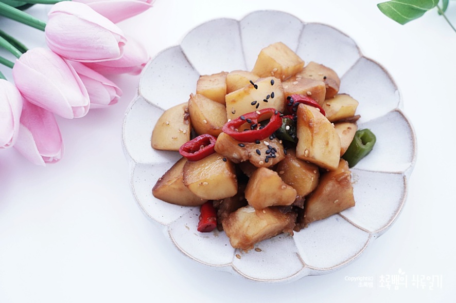 완성된 수미네반찬 감자조림이랍니다 감자가 알맞게 잘 익었어요 보통 너무 오랫동안 삶으면 으깨지는데요. 대략 저는 10~15분 정도 사이로 끓여서만들었던 것 같아요. 그 이상 조리하게 된다면 푹 익기 때문에시간 조절을 잘해주는 것이 중요한 것 같아요