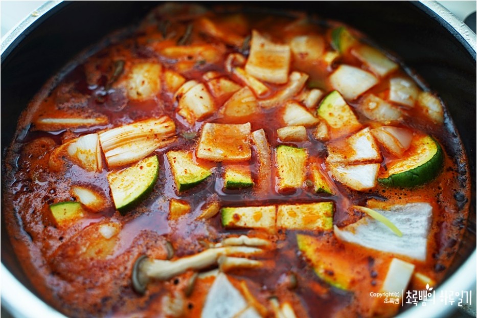 이렇게 보면 재료가 많아서 복잡하지 않을까 생각할 수 있는데 만들다 보면 그리 어렵지 않아요멸치 액젓이 들어간다는 점. 그리고 비교적 집에서 있는 재료로 만들어주니그리 어렵지 않게 만들 수 있어요. 방송에서는 애호박과 버섯은 넣지 않았지만 추가로 넣어주니 맛있었어요버섯은 표고버섯도 좋고 맛타리 버섯도 좋고 취향껏 넣어주면 좋을 것 같아요고기는 덩어리진 고기보다 이렇게 불고기처럼얇게 저민 고기가 개인적으로 맛있었답니다