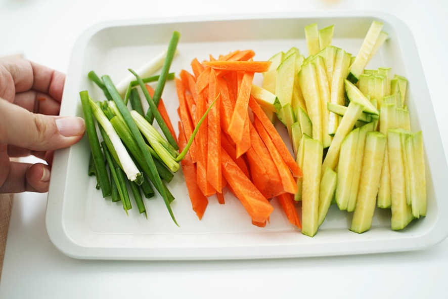 야채는 3가지가 들어가는데요. 애호박과 쪽파 그리고 당근이 들어가요. 아마도 영양을 위해선 야채를 넣으면 좋을 것 같아요~ 채를 썰어서 적당량을 잘라서 준비합니다. 2인분이라 조금씩 썰어서 준비했어요. 야채가 3개가 다 없다면 쪽파는 대파로~ 하는 분들도 계시고 당근이랑 애호박은 요즘 늘 냉장고에 있는 재료라 쉽게 구할 수 있는 것 같아요!!