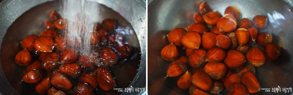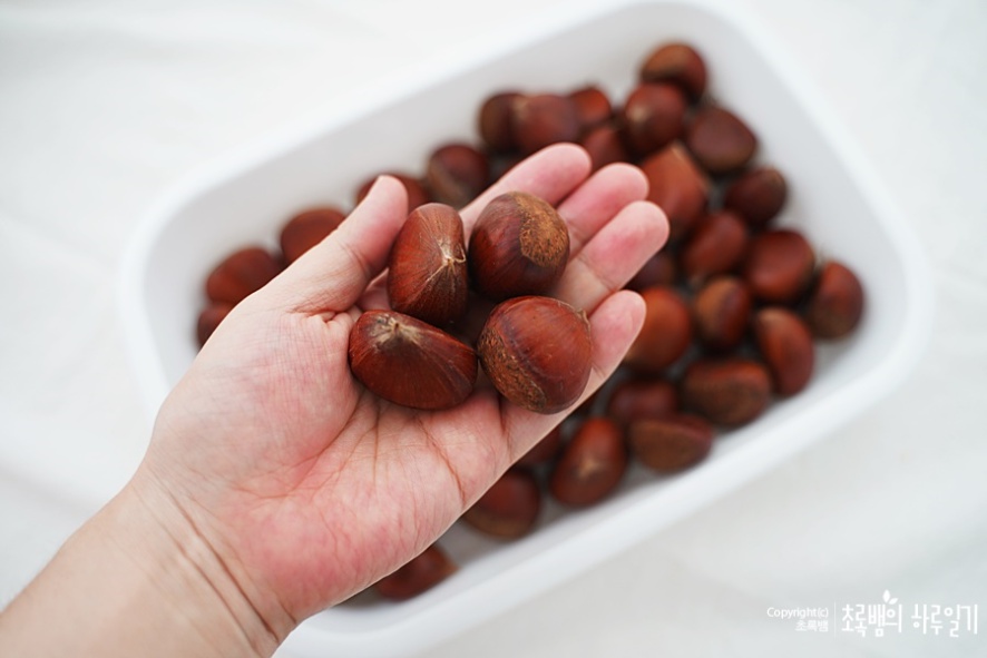 바로 물에 담가주기 대략 1시간 정도 담가주면 상한 밤은 위로 동동 뜨기 때문에 그것만 골라주면 됩니다.