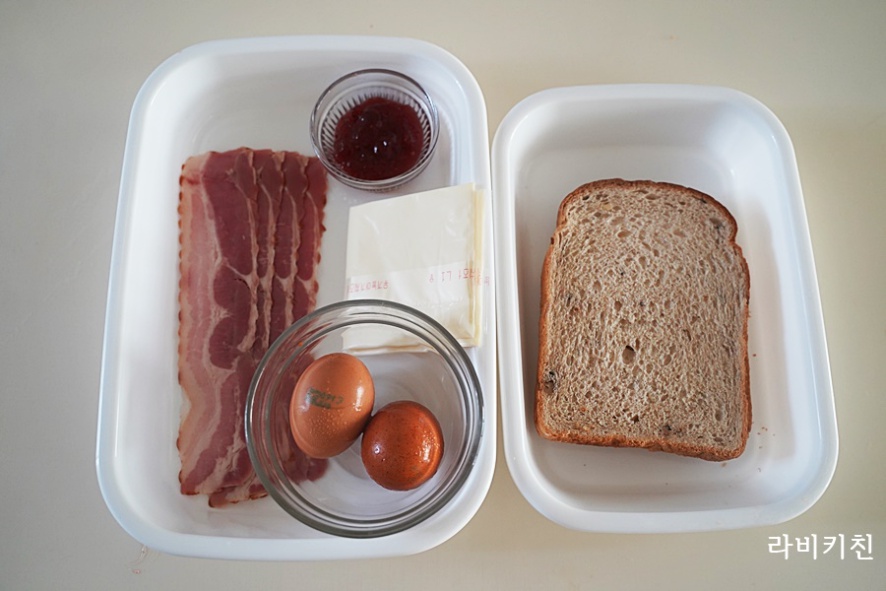 재료 : 식빵 2개, 계란 2개, 베이컨 4장, 딸기잼, 치즈 2장, 파슬리가루
