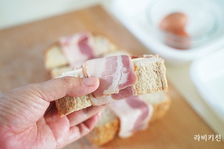 그리고 베이컨을 가지고 이렇게 빵에다 돌돌 말아줍니다.