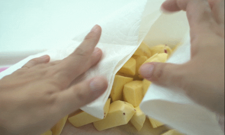 이렇게 키친타올에 고구마를 넣고 물기를 잘 닦아줍니다