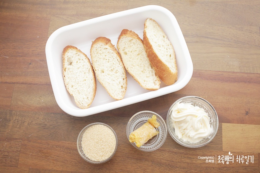 재료 : 바게트빵 4~5개, 마요네즈 3스푼, 설탕 2스푼, 다진 마늘 1스푼, 소금1꼬집