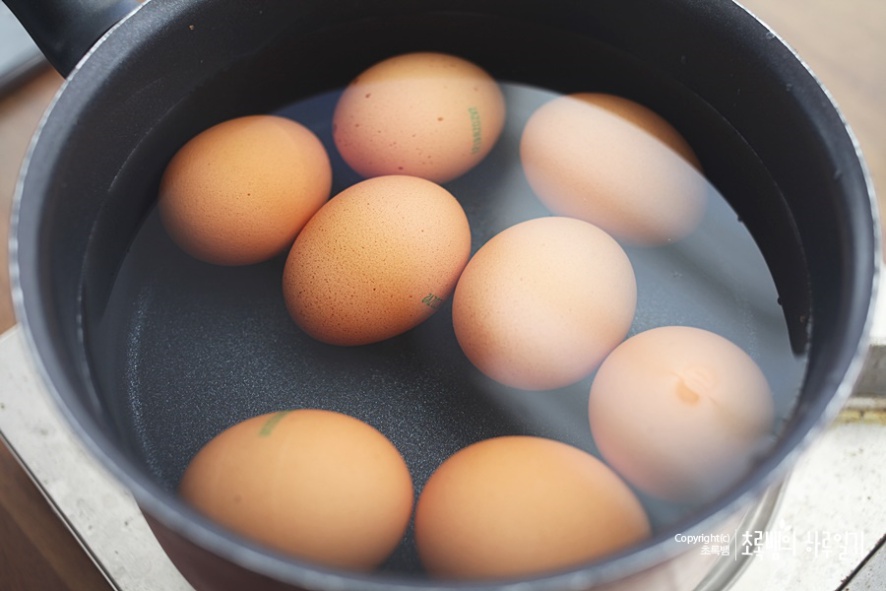 만들기 전에 꼭 해야 할 것은 냉장고에 있는 계란을 실온에 두는 것이랍니다. 그래야지 계란을 삶고 나서 껍질과 잘 분리되고 예쁘게 깔 수 있답니다.
