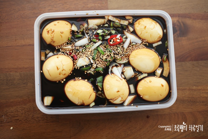 바로 먹어도 되긴 하지만 저는 대략 점심때 만들면 저녁에 먹으면 딱 좋더라고요. 냉장고에 5시간 정도 넣어서 숙성시켜줍니다. 양념이 쏙쏙 베여서 참 좋더라고요. 냉장고 가끔씩 열 때마다 살살 계란을 굴려줘도 좋아요