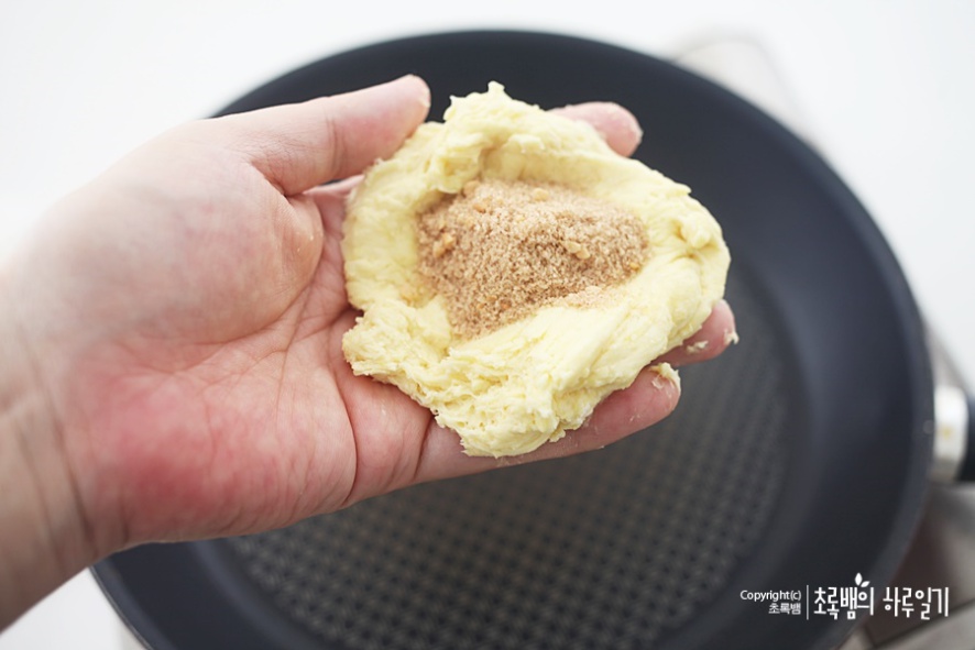 호떡의 반죽을 좀 넓게 해준 후 호떡의 속을 넣습니다.
